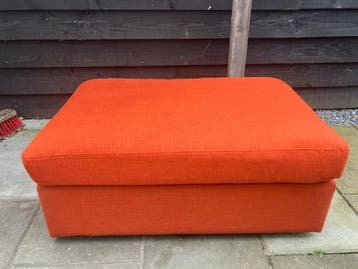Oranje poef van montel, op lage pootjes, perfect in vorm hoes kussen is een keer kop koffie overheen gegaan, maar is er af te halen en uitwasbaar, reinigbaar. Te groot voor onze kleine woonkamer, staa