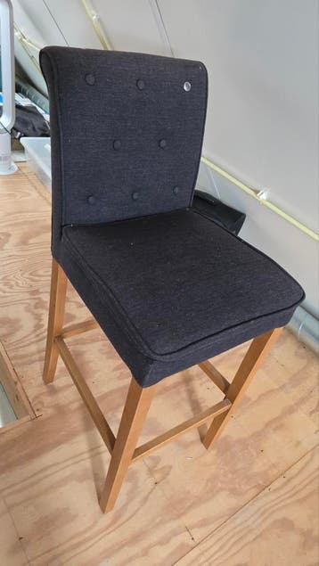 Twee riviera maison barkrukken met donkergrijze stoffen bekleding en houten poten. De zitting en rugleuning zijn gestoffeerd en hebben knopen. De krukken hebben een voetsteun.