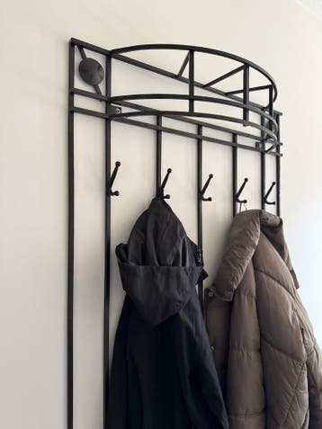 Metalen kapstok in donkergrijze kleur. Er zitten zes haken aan voor jassen en bovenop is er ruimte voor hoeden of sjaals. De kapstok is gratis op te halen.
