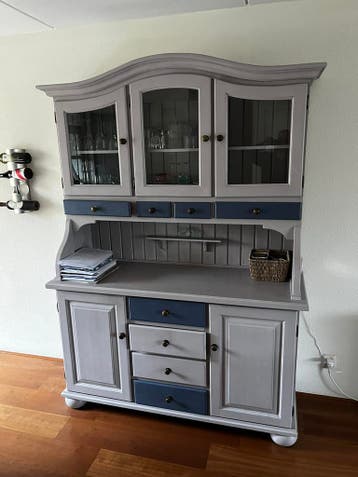 Aangeboden i.v.m. Andere inrichting woonkamer. Grenen solide buffetkast die we een paar jaar geleden een ander kleurtje hebben gegeven. Bestaat uit 2 losse delen (onder- en bovendeel). Ziet er nog goe