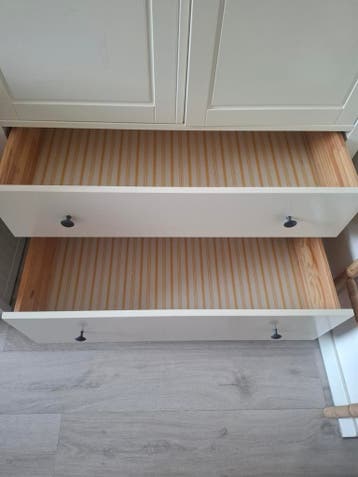 Een witte hemneskast met twee deuren en twee lades. Binnenin is er een hangroede en een plank. De achterwand heeft een gestreept patroon.