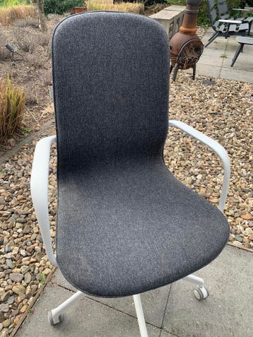 Een bureaustoel met een donkergrijze stoffen zitting en rugleuning. Het onderstel en de armleuningen zijn wit. De stoel heeft wieltjes.