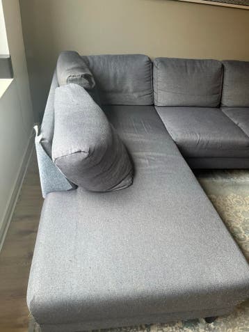 Deze ruime hoekbank is op zoek naar een nieuw thuis. De bank is gebruikt en heeft duidelijke beschadigingen aan de leuningen en achterkant, zoals te zien op de foto's. Desondanks biedt de bank nog