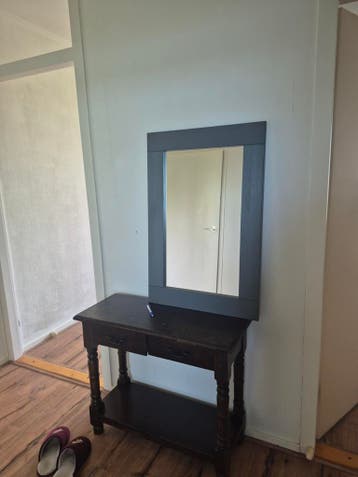 Mooi donkerbruin kastje met twee handige lades en een bijpassende spiegel. Ideaal voor in de hal, slaapkamer of als decoratief meubelstuk. Het kastje heeft gedraaide poten en een extra plank onderaan