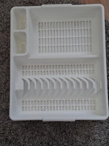 Een wit afdruiprek met vakjes voor bestek en een gedeelte voor borden. Handig voor in de keuken. Niet meer nodig.