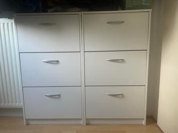 Twee witte schoenenkasten. Elk is 58,5 cm breed, 104,5 cm hoog en 16,6 cm diep. Ze hebben elk drie kleppen om schoenen in op te bergen.