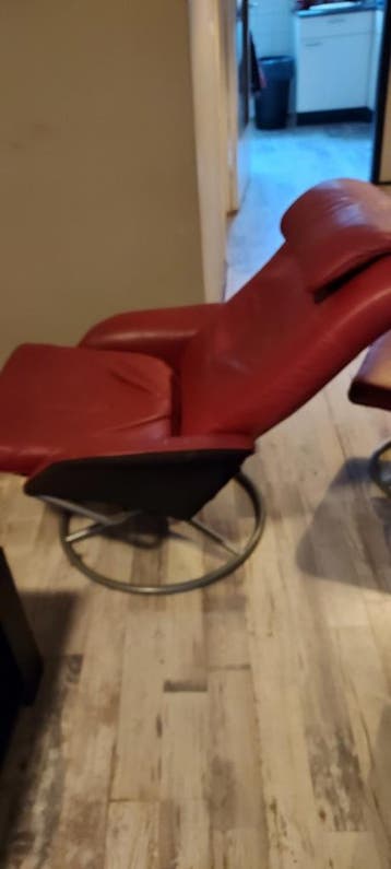 Comfortabele rode leren relaxstoel inclusief bijpassend voetenbankje. De stoel is gebruikt, maar kan zeker nog een ronde mee. Ideaal om heerlijk in te ontspannen na een lange dag. Gratis af te halen!