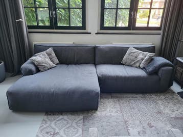 Een grijze hoekbank met een stoffen bekleding. De bank heeft een chaise longue aan de linkerkant. Zonder de decoratiekussens. Perfect voor in een keet/mancave