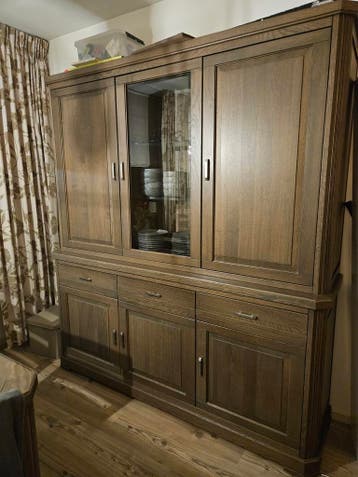 Mooie woonkamerkast gratis af te halen. De kast heeft zowel dichte deuren als een vitrinegedeelte met glazen deuren. Er zijn ook lades aanwezig voor extra opbergruimte. Zie mijn andere advertenties vo