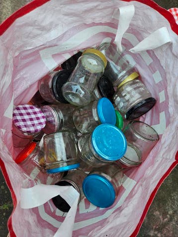 Grote tas vol met lege jampotjes. Ze zijn schoon. Verschillende maten. Enkel ophalen te yerseke
