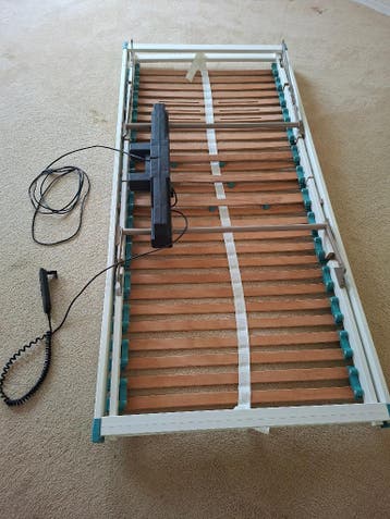 Twee elektrische houten lattenbodems. Ze kunnen in een bed ombouw geplaatst worden voeten- en hoofdeinde kunnen met handbediening omhoog gezet worden. Met matrasbeschermers afmetingen: 90 x 200 cm.