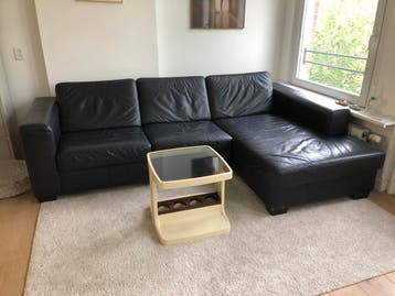 Deze week ophalen 3-zits zwarte leren bank - vintage modern design - chaise longue / hoekgedeelte - strakke lijnen, modern - goede staat, lichte gebruikssporen - afmeting: d 0.90 (Korte stuk) d 1.60 (
