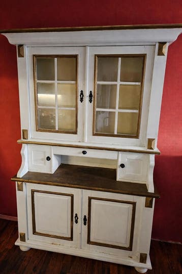 Mooie eiken kast, zwaar. De kast kan in 2 delen vervoerd worden. Komt uit een rookvrij huis. De afmetingen zijn: breedte 1,30m, diepte 47cm, hoogte 2m. De kast moet opnieuw opgeknapt worden, zoals te