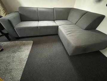Een grijze hoekbank met een stoffen bekleding. De bank heeft een chaise longue aan de rechterkant. De bank bestaat uit meerdere delen.
