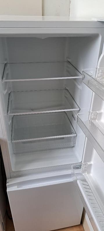 Hoog 143 cm, breed 49 cm, diep 56 cm, het koelgedeelte is 80 cm hoog en heeft 3 planken en een lade en een bruikbaar volume van 100 liter, het vriesgedeelte onderaan heeft 3 diepvries laden en een vol