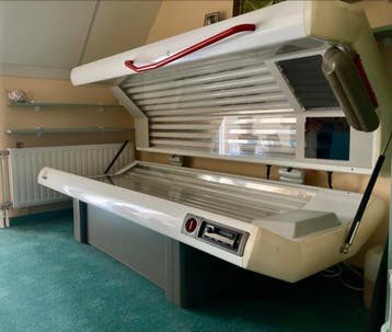 Deze dubbelzijdige zonnebank is al jaren niet gebruikt. Daarom zullen de buizen wel vervangen moeten worden (26 stuks!). De zonnebank is gemaakt voor professioneel gebruik en heeft krachtstroom nodig.