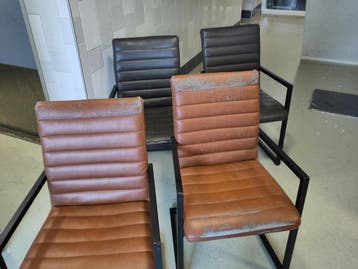 Eetkamerstoelen in twee kleuren. Bekleding laat los, met name de bruine bekleding bladdert af. Zitten erg fijn. Gratis op te halen