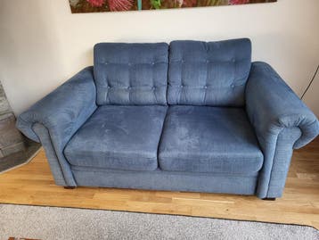 Dit is een tweezits bankstel. Het is gebruikt, maar ziet er nog mooi uit. De bank is 180 cm breed. De stof is blauw van kleur en heeft knopen in de rugleuning. De bank mag maandag of dinsdag gratis op