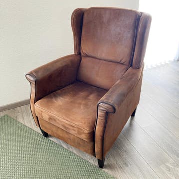 Gratis 2 oorfauteuils, bekleding lichtbruin tasan-leder (microvezel oppervlak) en donkerbruine bies. Van één is de achterzijde lichter verkleurd. Toelichting tasan-leder zie tekst-foto zithoogte 42cm